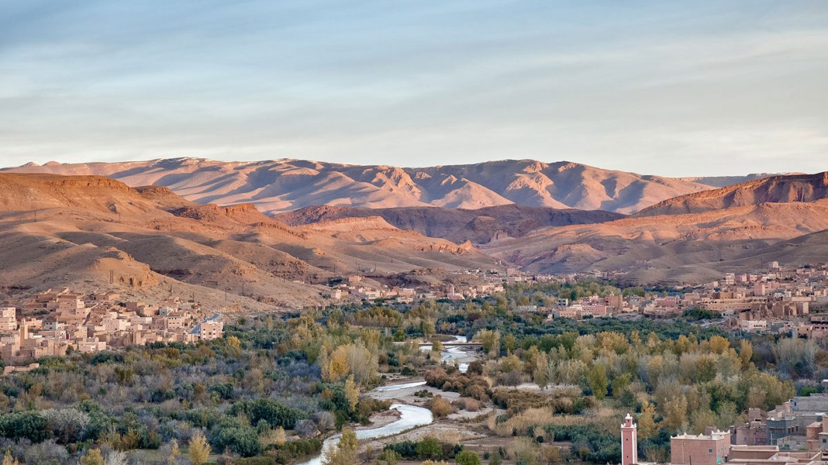 Travel from Marrakech towards Ouarzazate. Visit the Canal du Rocade. Continue to the Tagudalt Café Roof Terrace for views of the Atlas Mountains.